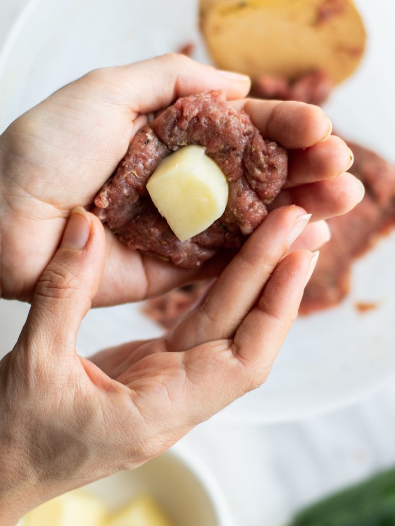 - Scoop about 2 tablespoons of the meat mixture into your hand, flatten it slightly, and place a cube of mozzarella in the center.